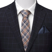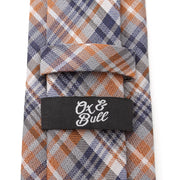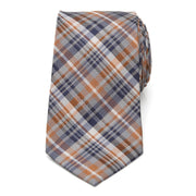This 100% silk tie weaves gray, navy, and burnt orange in a plaid pattern. The combination of colors allows for versatile wear and a variety of styles to pair it with. A perfect tie for both professional and casual events.