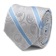 Classic colors meet modern design in our Marvel Comics Gray and Blue Stripe Tie. Nestled between diagonal stripes of pale blue you'll find gray icon motifs of Marvel's most beloved characters such as Iron Man, Thor, Hulk, Spider-Man, and Captain America. Our tie will maintain its shape and hold a perfect knot thanks to the durable yet soft 100% Silk. Officially licensed by Marvel.