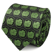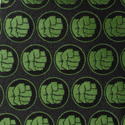 The mean, green, fighting machine. The Incredible Hulk. Dress up your shirt with his uncontrollable power alongside our Hulk Black Men's Tie. Motifs of his clenched green fist blend with the black base of the tie, creating an iridescent sheen. Imbued with the power of superhero craftsmanship, this 100% silk tie is built to withstand the mightiest battles while making sure you'll always maintain your sharp, heroic look. Wear alone or pair with our Hulk Fist Cufflinks to create a SMASH-ing pair. Officially licensed by Marvel.