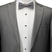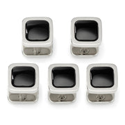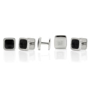 A beautiful cushion-cut onyx stone sits in a shiny silver setting which has been etched on three sides, creating a unique visual effect on this stud set. Our studs are made with a fixed backing for ease of dress. The expert craftsmanship of our stainless steel studs ensures long-lasting durability. Pairs perfectly with our Onyx Cushion Stainless Steel Cufflinks to create a matching set.