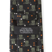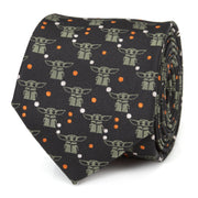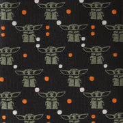 This subtle yet professional Star Wars tie features rows of sage green Grogu motifs, better known as The Child, stitched on a black silk base. Dots of orange and white compliment and brighten the design of the tie, creating a dot pattern. This tie will maintain its shape and hold a perfect knot thanks to the durable yet stylish 100% Polyester. A perfect accessory for lovers of the Star Wars universe. Pairs with any of our other Mandalorian products. Officially licensed by LucasFilm LTD.