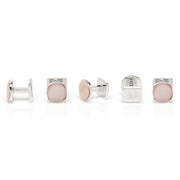 Beautiful creamy pink mother of pearl has been cut into a cushioned disc and surrounded in shiny sterling silver, to create this elegant set of cufflinks and tuxedo studs. Cufflinks feature round logo swivel closures for ease of dressing, and the studs have soft-edged fixed backings to keep them in place all night long. Perfect for any spring or summer formal occasions. Includes gift box.