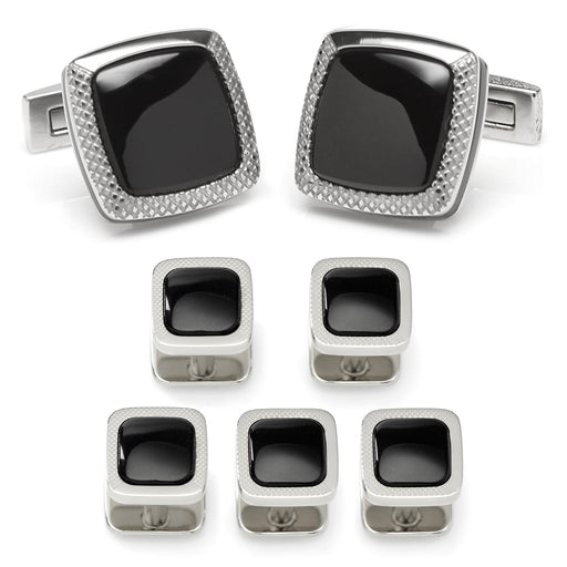View full detailsA beautiful cushion-cut onyx stone sits in a shiny silver setting which has been etched on three sides, creating a unique visual effect on this stu...