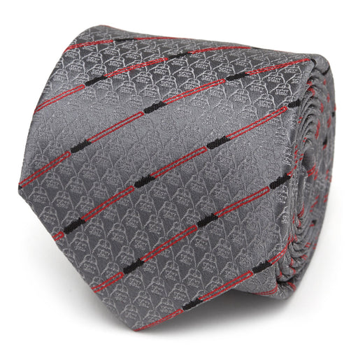 View full detailsExpertly woven using gray, black, and scarlet red threads, this 100% silk iridescent tie features a series of bold lightsaber images set against ro...