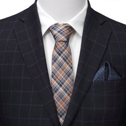 View full detailsThis 100% silk tie weaves gray, navy, and burnt orange in a plaid pattern. The combination of colors allows for versatile wear and a variety of sty...