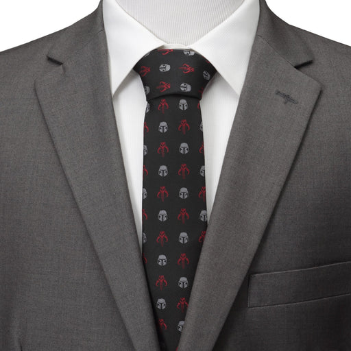 View full detailsA man of your skill should make short work of wearing this tie. Featuring alternating rows of crimson Mythosaur skulls and silver Mando helmets, ou...