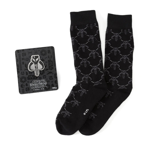 View full detailsEmbark on a stylish adventure with the Mandalorian Charcoal Gift Set. This sleek set includes a pair of black socks featuring the Mythosaur Skull a...