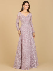 Gorgeous floral pattern ball gown with v-neckline and sheer long sleeves. This gorgeous ballgown offers a modest design and is sure to be the center of attention at your next event. Great for a mother of bride or mother of the groom dress. A gown that's a statement but still offers modesty for a mother!