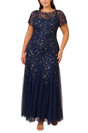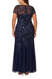 Adrianna Papell Boat Neck Short Sleeves Back Zipper Long Beaded Mesh Dress (Plus Size)