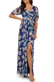 Adrianna Papell Floral Print Pleating Surplice V-Neckline Short Sleeves Elastic Cuffs Ruched Waist Seam Front Slit Chiffon Maxi Dress