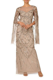 Adrianna Papell Sweetheart Boat Neck Cape Sleeves Beaded Mesh Illusion Trim Flutter Hemline Sheath Floor-Length Silhouette Dress