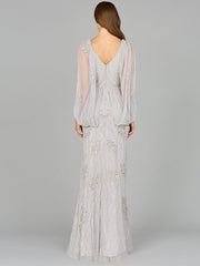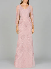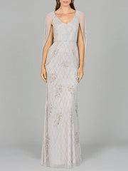 Intricately beaded dress featuring beautiful draped cape sleeves in two beautiful and elegant colors. This dress features stunning beaded details and crystals throughout with a v-neckline and mid back.