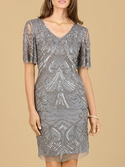 Beaded v-neckline cocktail dress. This dress features a sheath skirt giving an elegant and classy look for someone searching for a modest short dress. Perfect for a fun and fancy birthday or a wedding guest!