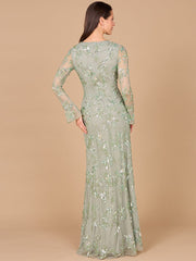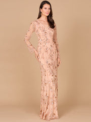 Elegant and exclusive, this full-length dress features a tulle fabric and a v neckline with long sleeves. Adorned with delicate seed beads and sparkling sequins in sophisticated colors, it is the perfect choice for a luxurious wedding or a stylish mother of the bride.
