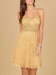 This stunning mini is a v-neck beaded cocktail dress designed with feathers on the skirt. A structured bodice adds shape to the flowing a-line silhouette, creating a statement-making design for any special occasion.