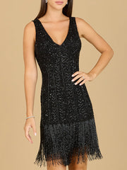 Sleeveless, v-neck beaded cocktail dress embellished with beaded fringe along the hem of the dress.