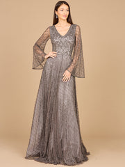 This gown with a flowy, pleated skirt features long sleeves, v neckline and has embellishments in an art deco and lined pattern. This exquisite dress is the embodiment of attentive craftsmanship and will create a lasting impression at any formal event.