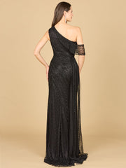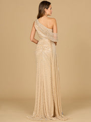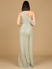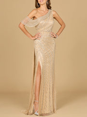 Beaded one shoulder gown featuring an off shoulder detail. This glittering dress features a train detail from the hip and a showcasing slit.. You are sure to sparkle and shine in this one of a kind gown.