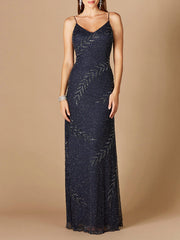Beaded Spaghetti Strap Navy Full-Length Gown