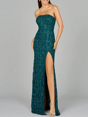 Strapless dress features rhinestones and beads in a gorgeous pattern. Breathtaking style features a straight neckline and a high slit.
