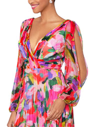 Betsy and Adam Amber Print Deep V-Neckline Long Sleeves Back Zipper Flowy Skirt Floor Length Dress