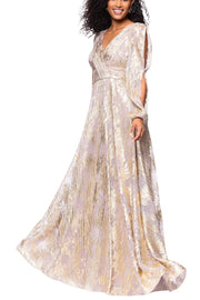 Turn heads and shimmer under the lights in the Betsy and Adam Marla Deep V-Neckline Long Billowy Cutout Sleeves Wrap-Style Bodice Dress—a bold and beautiful choice for formal affairs, black-tie events, and summer soirées. Designed for women who want to make an entrance, this gown blends dramatic flair with radiant elegance.