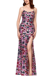 A27017 Betsy and Adam Miley Floral Sequin Floor Length Dress