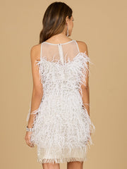 Cute illusion neckline fitted short dress with allover feathers and beads. Stand out in this stunning cocktail dress for your bridal shower, bachelorette or a dress to change into during your reception!