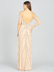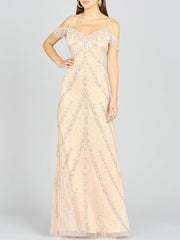 From our new brand, Friday the 18th, this off-shoulder dress features beaded fringe on the bodice and rhinestones and beads in a striped pattern. This sweetheart neck dress is classy in the front and a party in the back with the plunging v back. A dress fit for any occasion, this is as versatile as it gets.