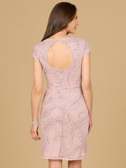 Short V-neckline cap sleeve dress fully embellished with beads and features a keyhole back. Stretch tulle fabric on polyester lining which hugs and accentuates your curves. Wear this to any formal evening event or as a classy modest dinner dress.
