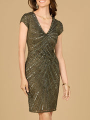 Short V-neckline cap sleeve dress fully embellished with beads and features a keyhole back. Stretch tulle fabric on polyester lining which hugs and accentuates your curves. Wear this to any formal evening event or as a classy modest dinner dress.