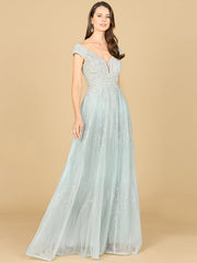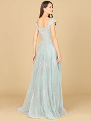 Beautiful tonal lace ballgown featuring delicate cap sleeves. This gown features an embellished bodice and a v-neckline. Sparkle at your next big event in this dress!