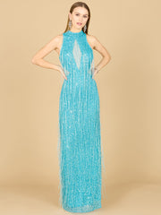 Our new brand, Friday the 18th features this STUNNING halter neck dress with beaded fringe all over. Features mesh lined cut outs at the waist to accentuate your curves and a keyhole detail on the bodice.