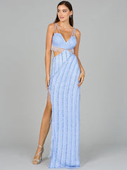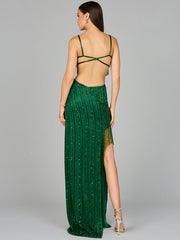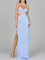 This beaded, spaghetti strap dress has a high slit and low lace-up back. The silhouette fits like a glove for most body types. A perfect dress for all ages or a fancy night out!