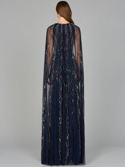 Elegant beaded gown featuring modest coverage with a high neckline and high back with a dramatic cape for some arm coverage. We think this dress is perfect for a woman of any age.