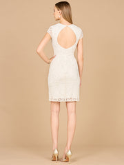 Short V-neckline cap sleeve dress fully embellished with beads and features a keyhole back. Stretch tulle fabric on polyester lining which hugs and accentuates your curves. Loving this look as an elegant and elevated bridal event dress. Depending on your height it will be just below your knees.