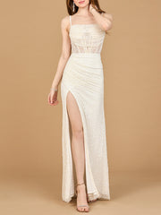 Elegant look? Check. Sweetheart neckline? Double check. See-through bodice & high slit? Triple check! This glamorous gown is guaranteed to turn heads at your next shindig—spaghetti straps and a see-through back make this beaded corset dress a real showstopper!