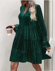 Elegant Velvet Long Sleeve V-Neck Solid Color Dress
