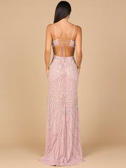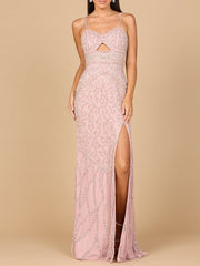 This sparkling, spaghetti strap gown features a daring side slit and low, tie-up back. It's designed to hug every shape, making it the ideal dress for any age so you'll be lift-the-roof-ready!