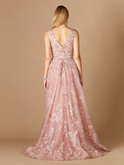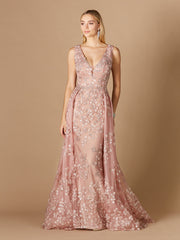 A new take on our best selling overskirt styles. This floral applique long gown features a v-neckline and sweeping overskirt with all over beading.
