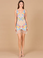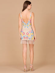 Cocktail dress fully embellished with sequins and beads in a multi-color floral pattern. Features fringy details at the hem and a symmetrical beaded design throughout the bodice. This stretchy fabric dress is comfortable for a late-night party!