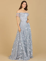 The perfect off shoulder, A-line ball gown with a full embroidered and beaded skirt. Features an elegant leaf pattern with a dimensional look.