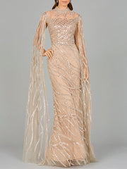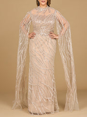 Chic fitted dress with a high neck and lengthy cape-style sleeves that sweep the floor. This dress boasts a glimmering bodice and chic coverage with dreamy embroidery—A grand entrance awaits!