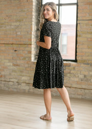 The Jenna Floral Knit Midi Dress blends effortless style and comfort for a year round dress. Made in the USA from soft, stretchy knit fabric, it features a modest round neckline, short sleeves, and an elastic waist for a flattering fit. The tiered skirt adds feminine flow, making it perfect for everyday wear. Pair this floral midi dress with sneakers or flats for an easy, polished look.