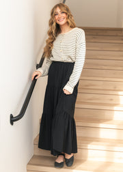 The Jill Stretch Waist Tiered Maxi Skirt is a versatile wardrobe staple. Crafted in the USA with soft, flowy tiers and a stretch waistband, it delivers effortless comfort and a flattering silhouette. The classic black color makes it easy to dress up or down for any occasion—perfect for church, brunch, or casual outings with year-round styling potential.
