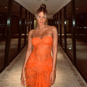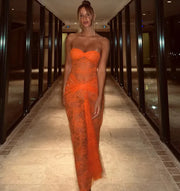 This chic sheath dress combines elegance with a touch of allure, featuring a lace chest wrap and a see-through panel for a modern, sophisticated look. The slim-fit design contours to your shape, making it perfect for evenings or special occasions. Its solid color enhances the sleek style, offering a refined and fashionable appearance.
