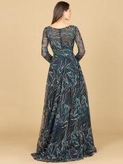 Gorgeous floral pattern ball gown with v-neckline and sheer long sleeves. This gorgeous ballgown offers a modest design and is sure to be the center of attention at your next event. Great for a mother of bride or mother of the groom dress. A gown that's a statement but still offers modesty for a mother!