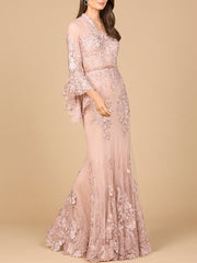 Lace, V Neck, Long Bell Sleeve Gown