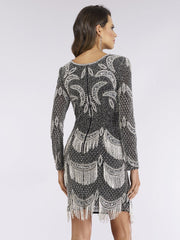Lara 29377 - Long Sleeve Beaded V-Neck Fringe Cocktail Dress