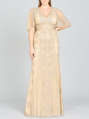 This cape sleeve gown features a v-neckline and geometric beading patterns. The stretchy material makes fitting easy for any size. Perfect for the mother of the bride.